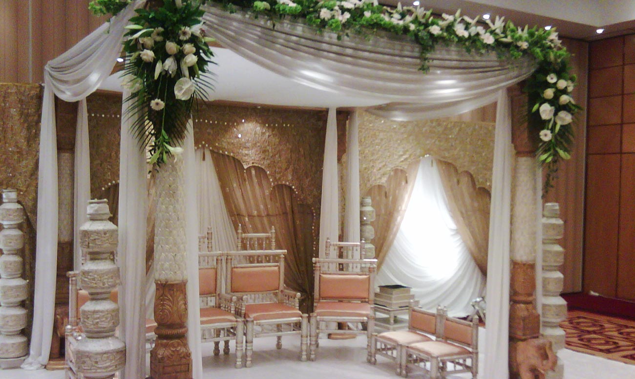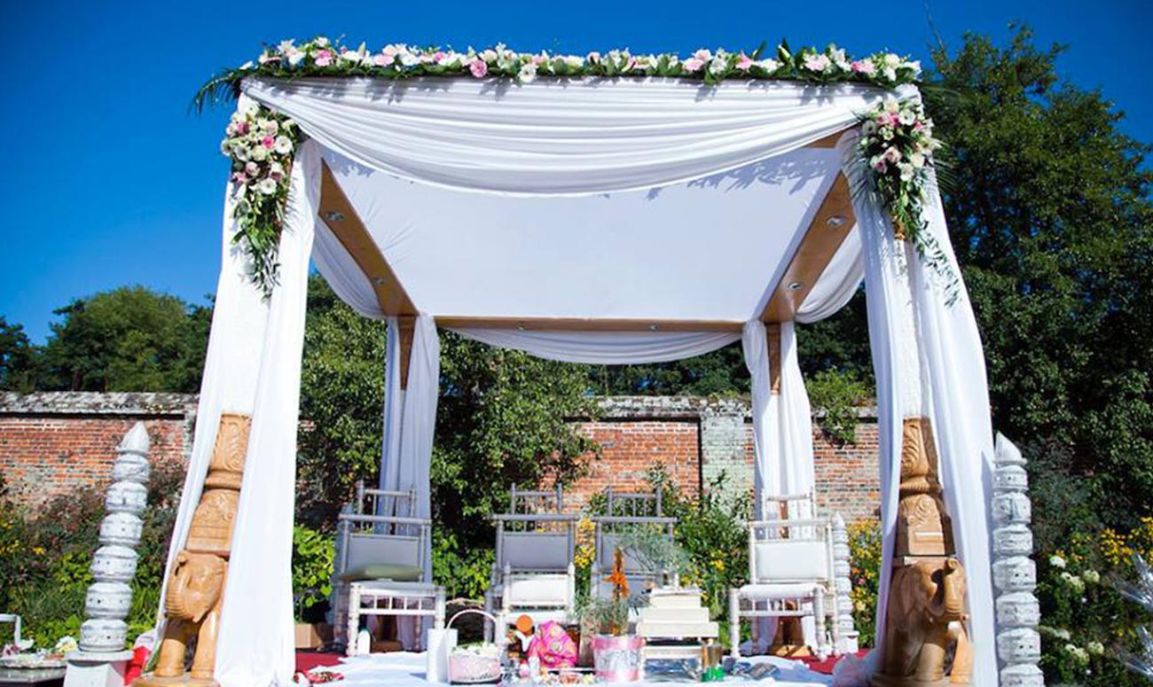 Delicate ivory drapes grace this wooden carved elephant based Mandap. A simple Mandap that is stunning and perfect for outdoor and marquee weddings.
