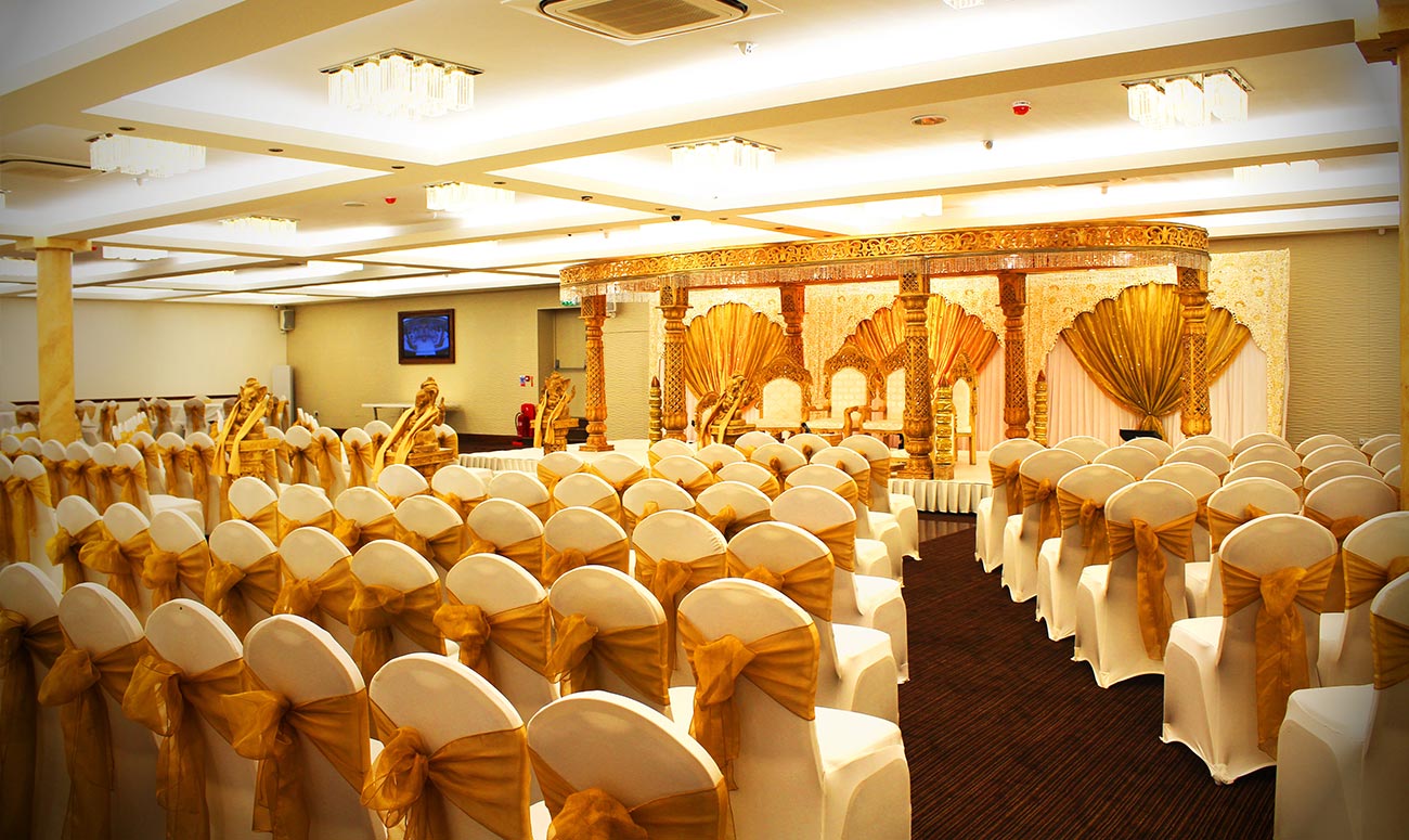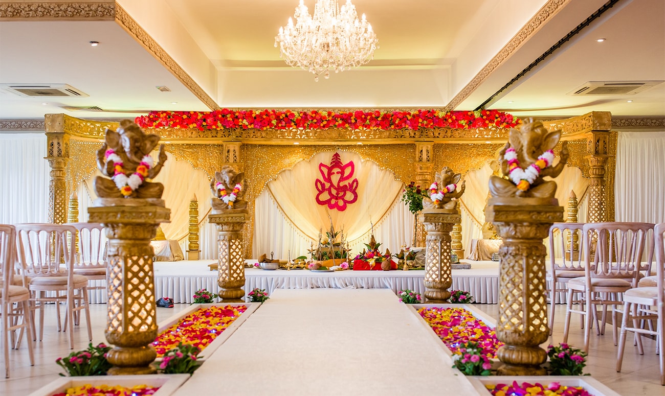 Add glamour to your big day with our fibre glass oval shaped Roma Mandap in a wooden finish featuring a Swarovski crystal finish in addition to the hand carved artwork on her beautiful pillars. A simply beautiful design.