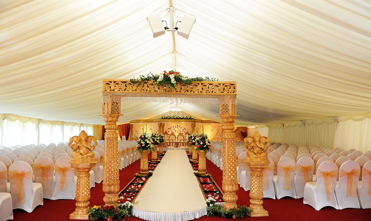 Add glamour to your big day with our fibre glass wooden finish Roma Mandap featuring a Swarovski crystal finish in addition to the hand carved artwork on her beautiful pillars. A simply beautiful design.