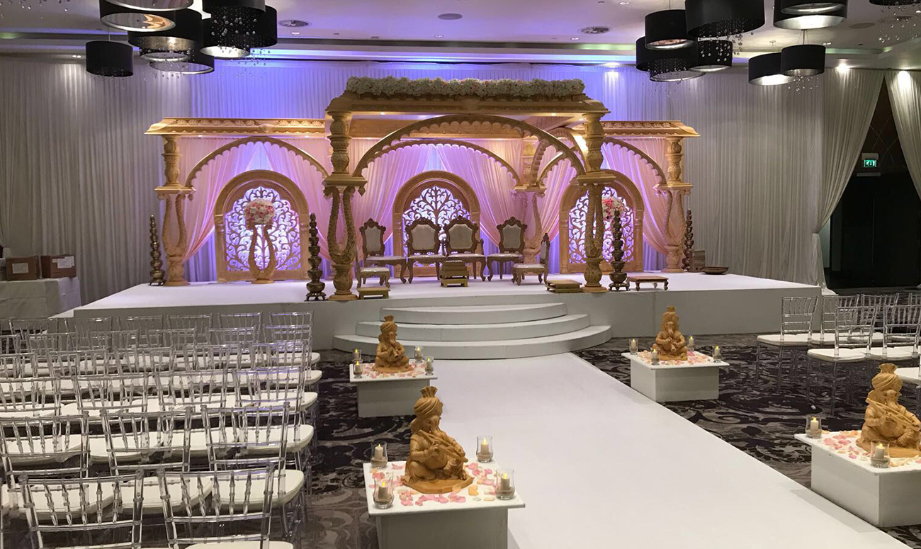 An exclusive Mandap with a difference, Trivedi's hand carved arched roof supported by delicate pillars is a beautiful design which is sure to transform any venue.